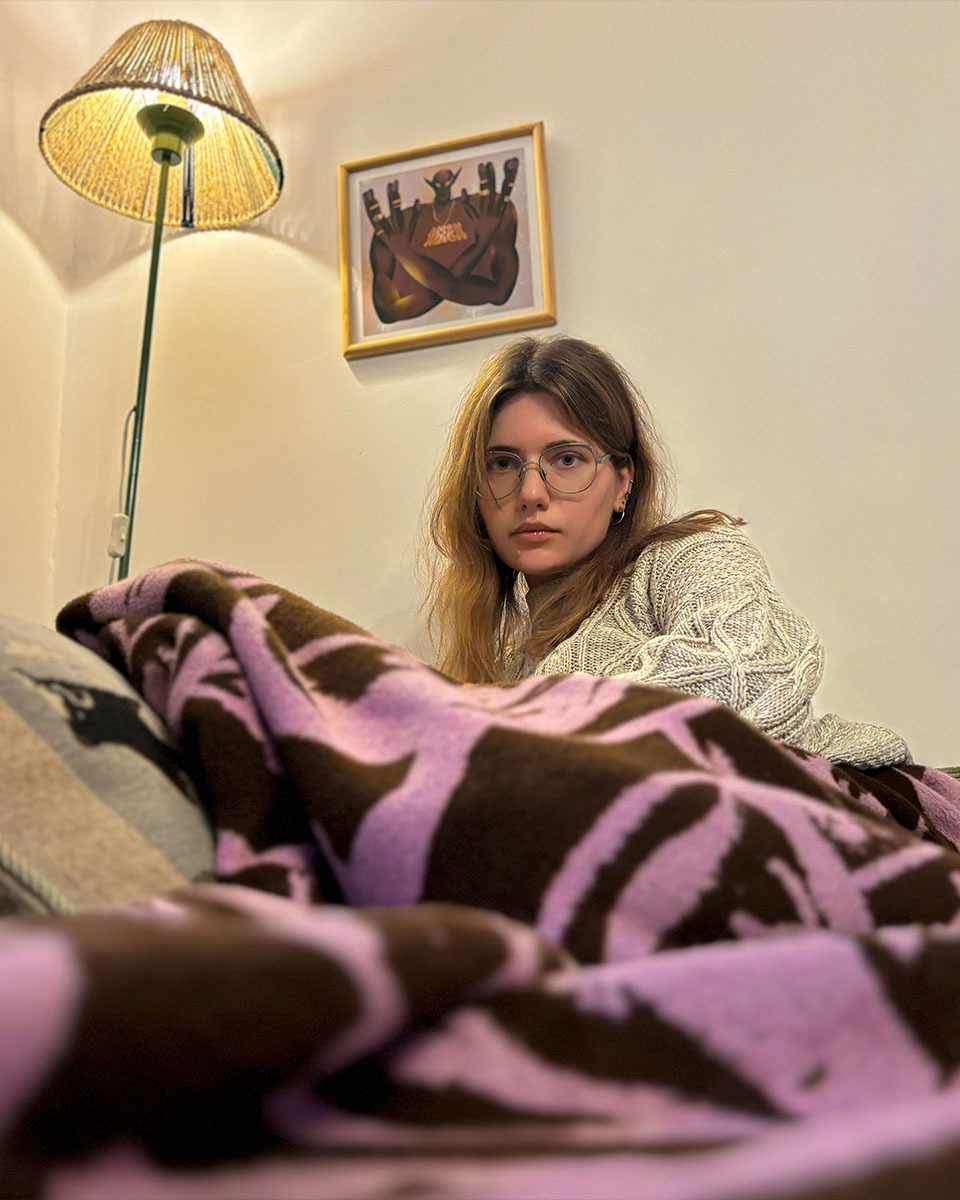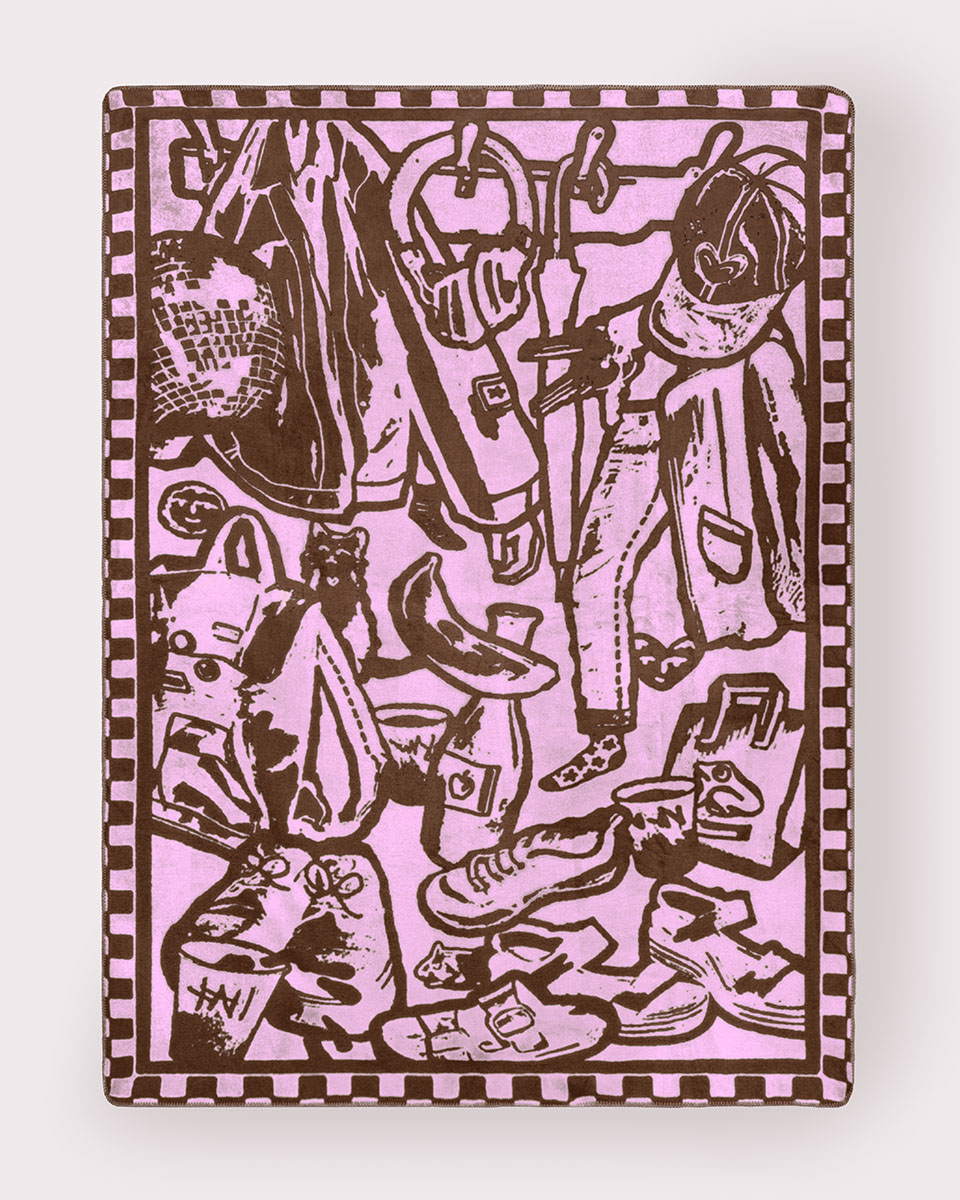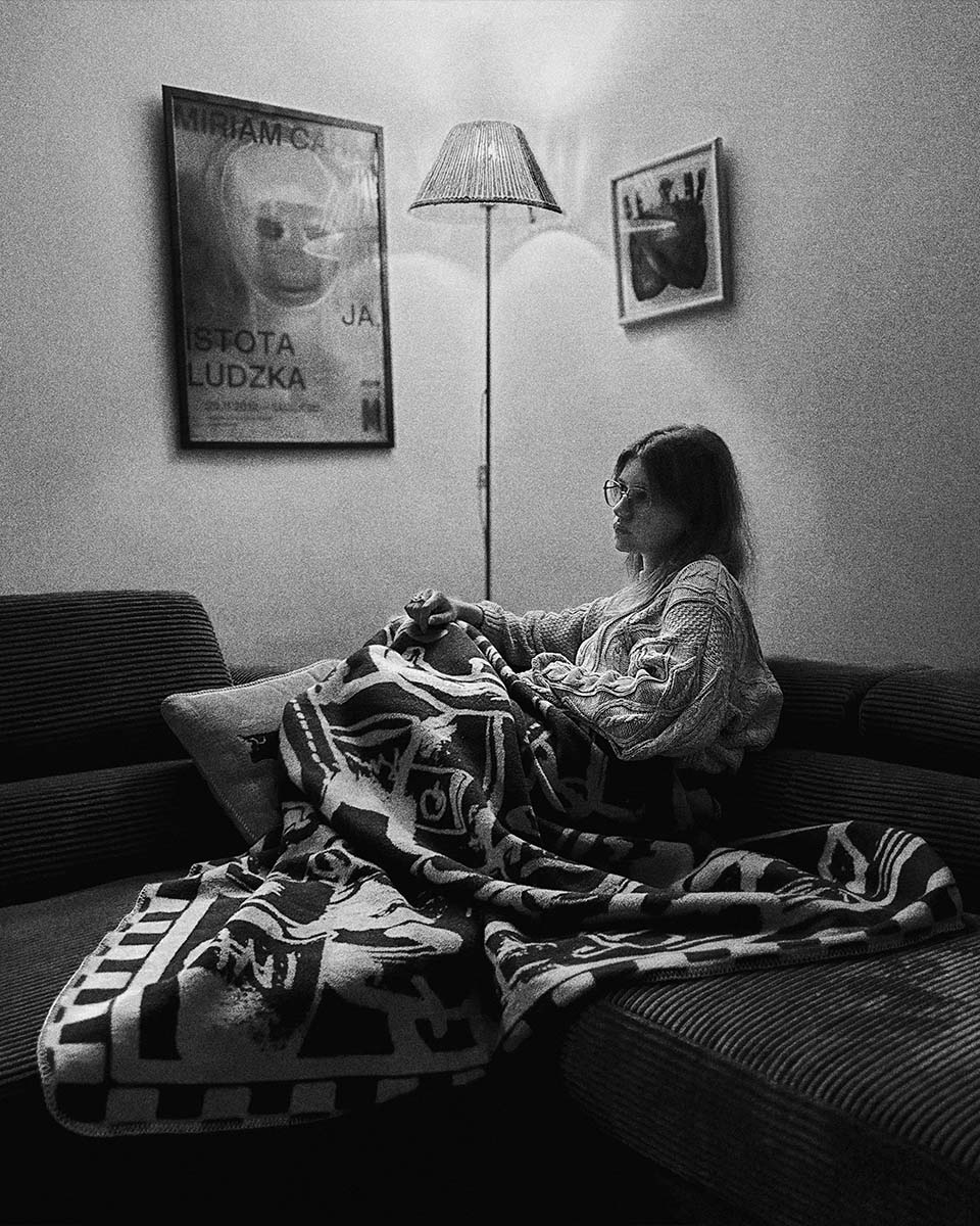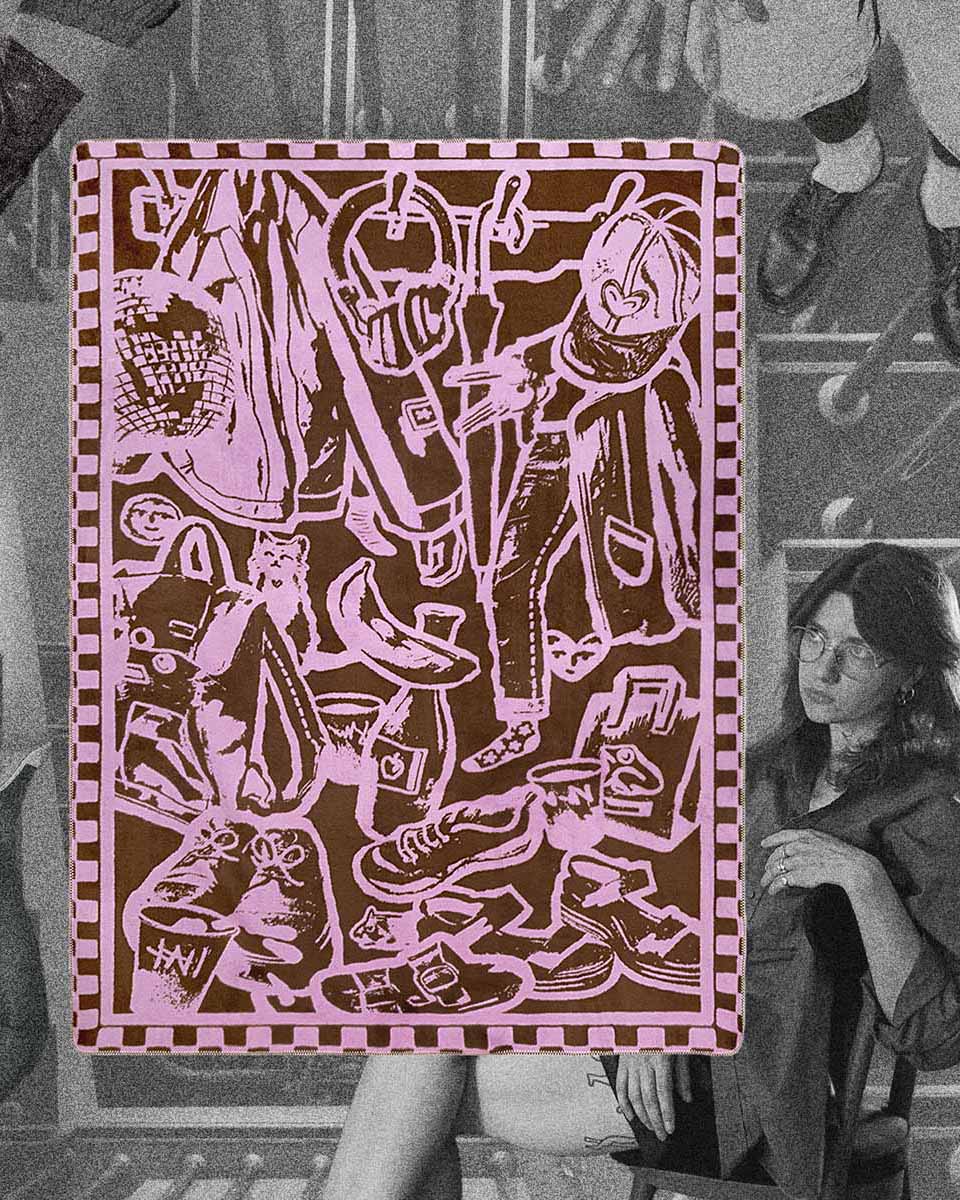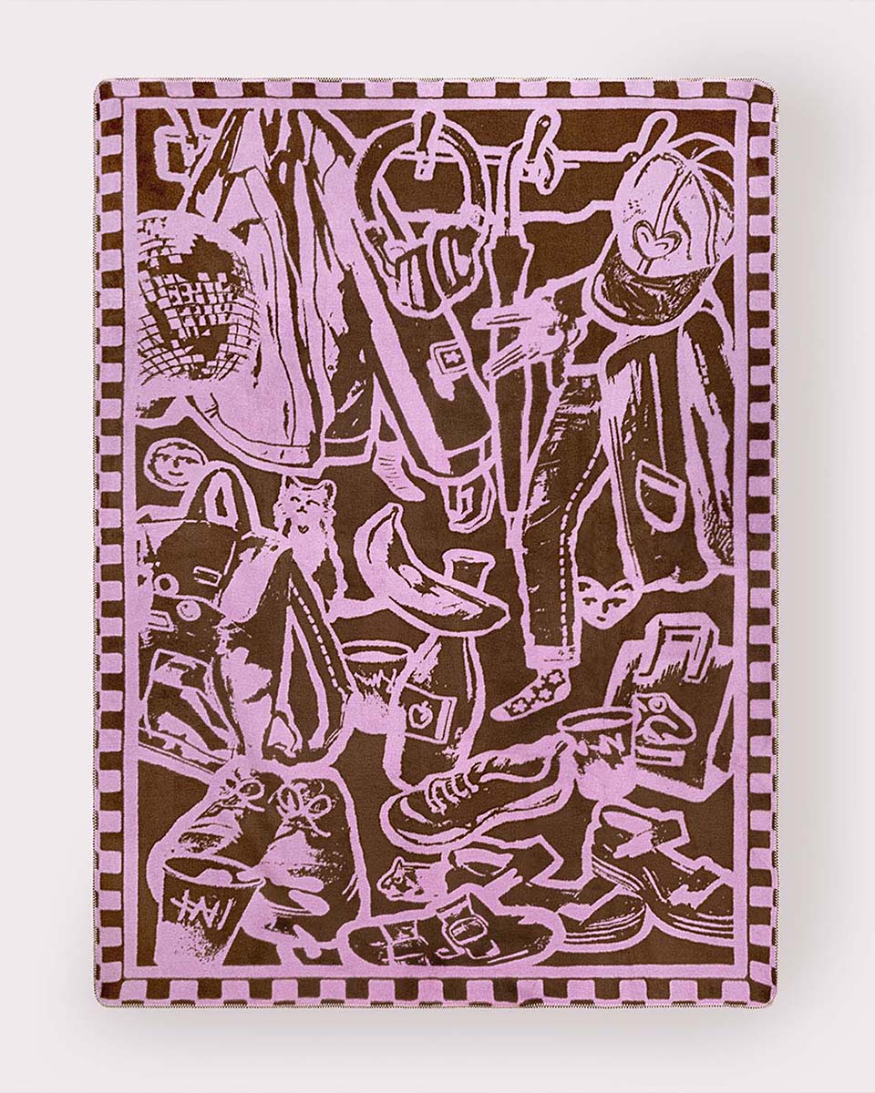 Brązowy koc żakardowy “Przedpokój”, bo Domówka to nie tylko spotkanie przyjaciół, ale również garderoby. Gustowne kurtki oraz kolorowe szaliki i czapki układają się mozaikę godną najlepszych galerii.