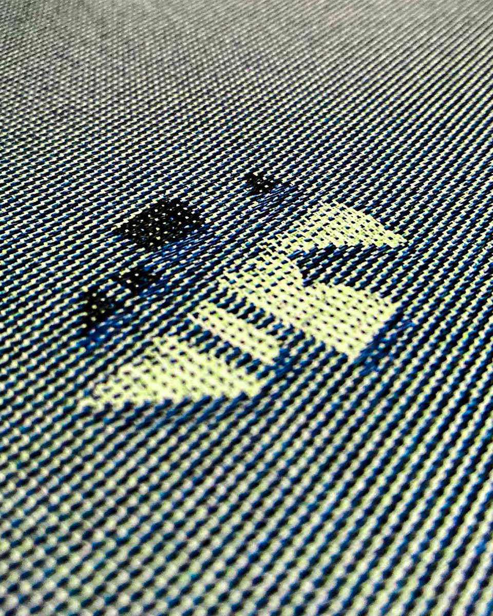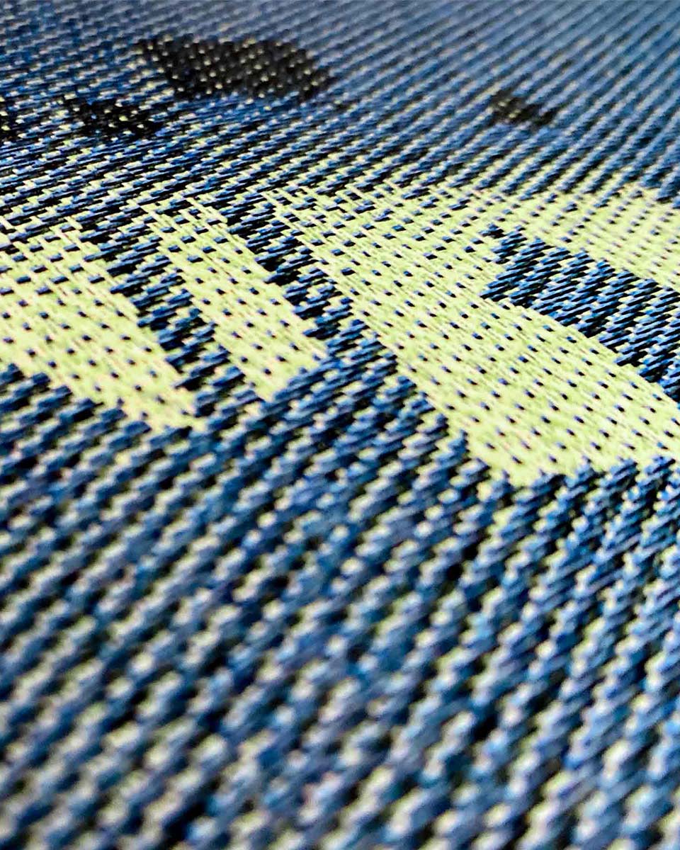 Plakat jest symulacją tkaniny żakardowej, stworzonej na splotach prawdziwej przędzy.