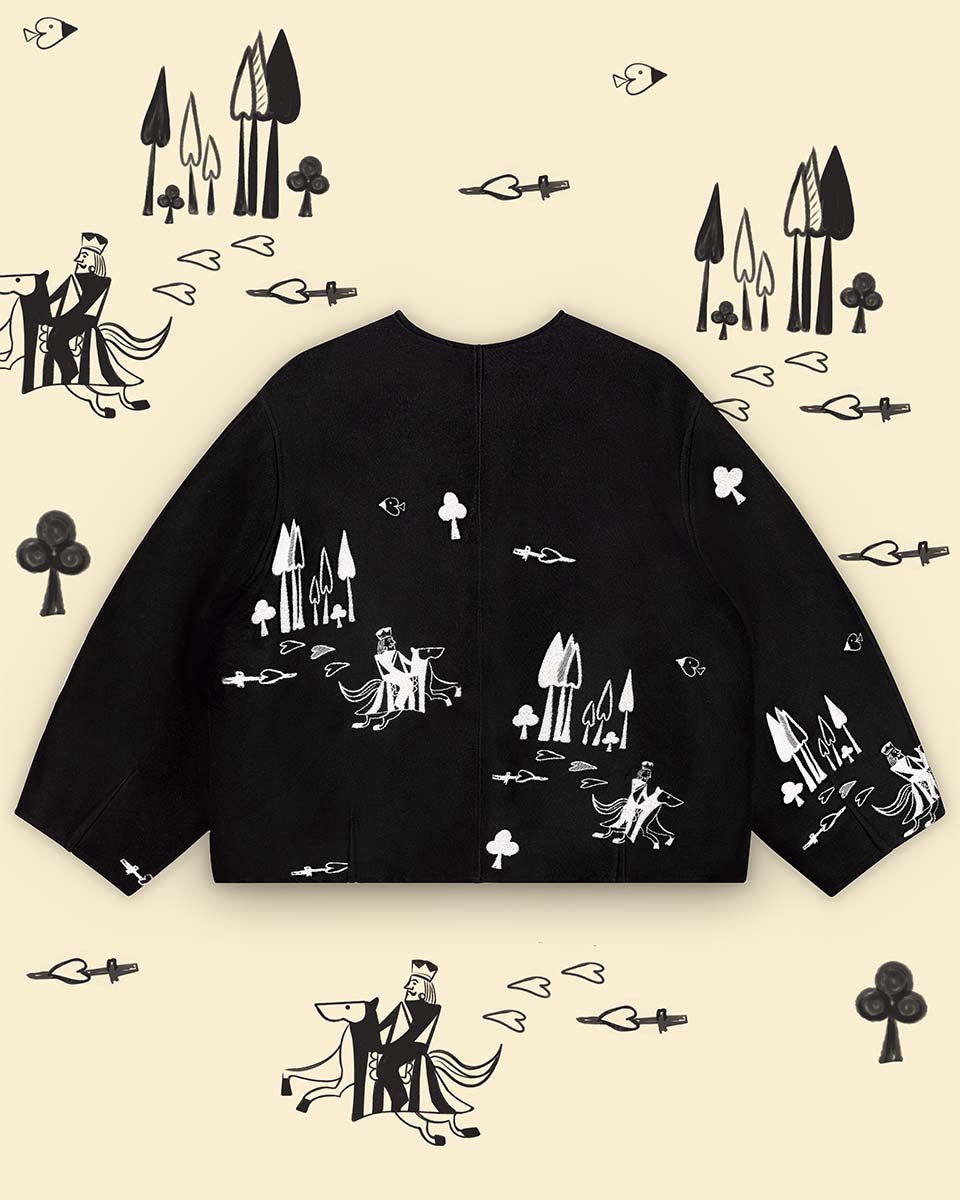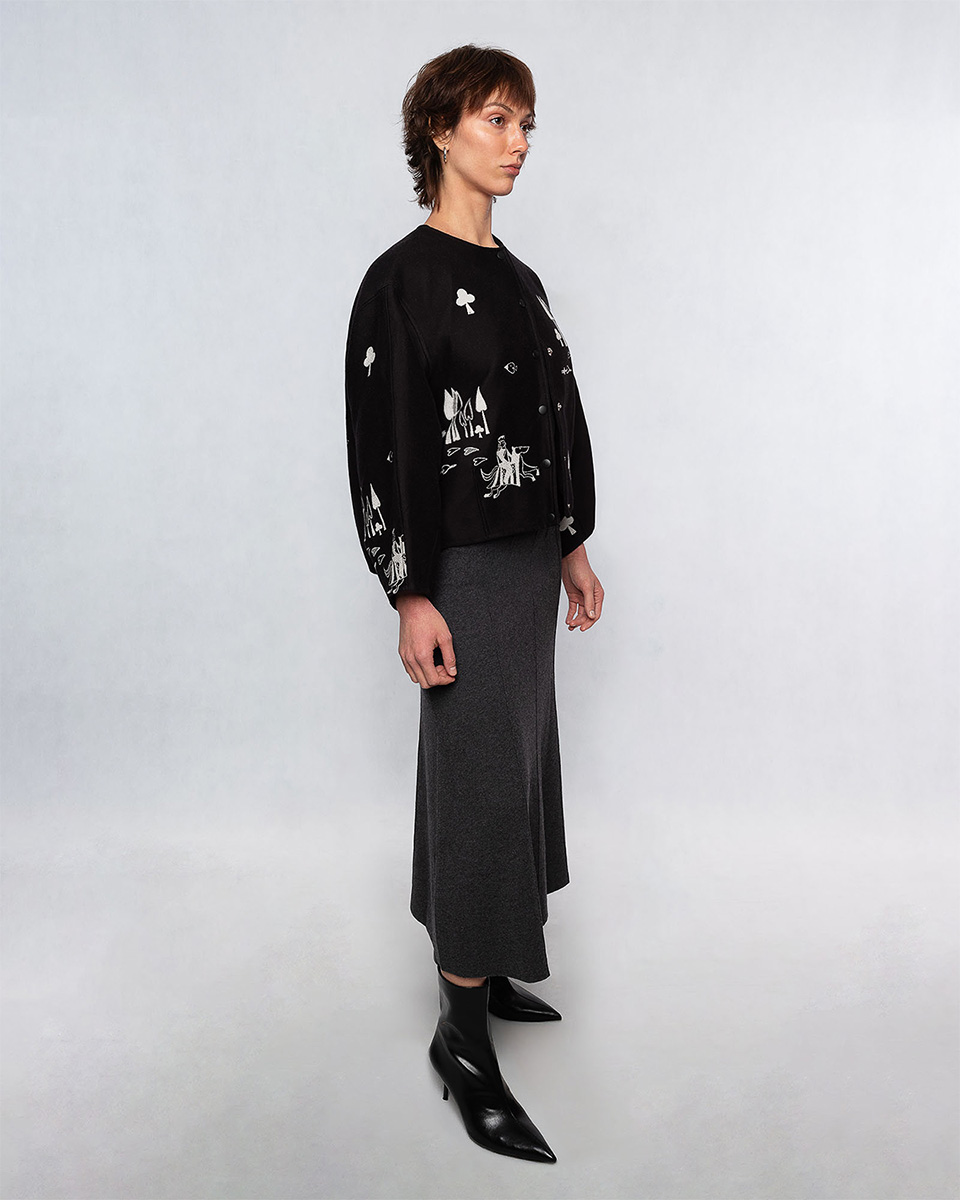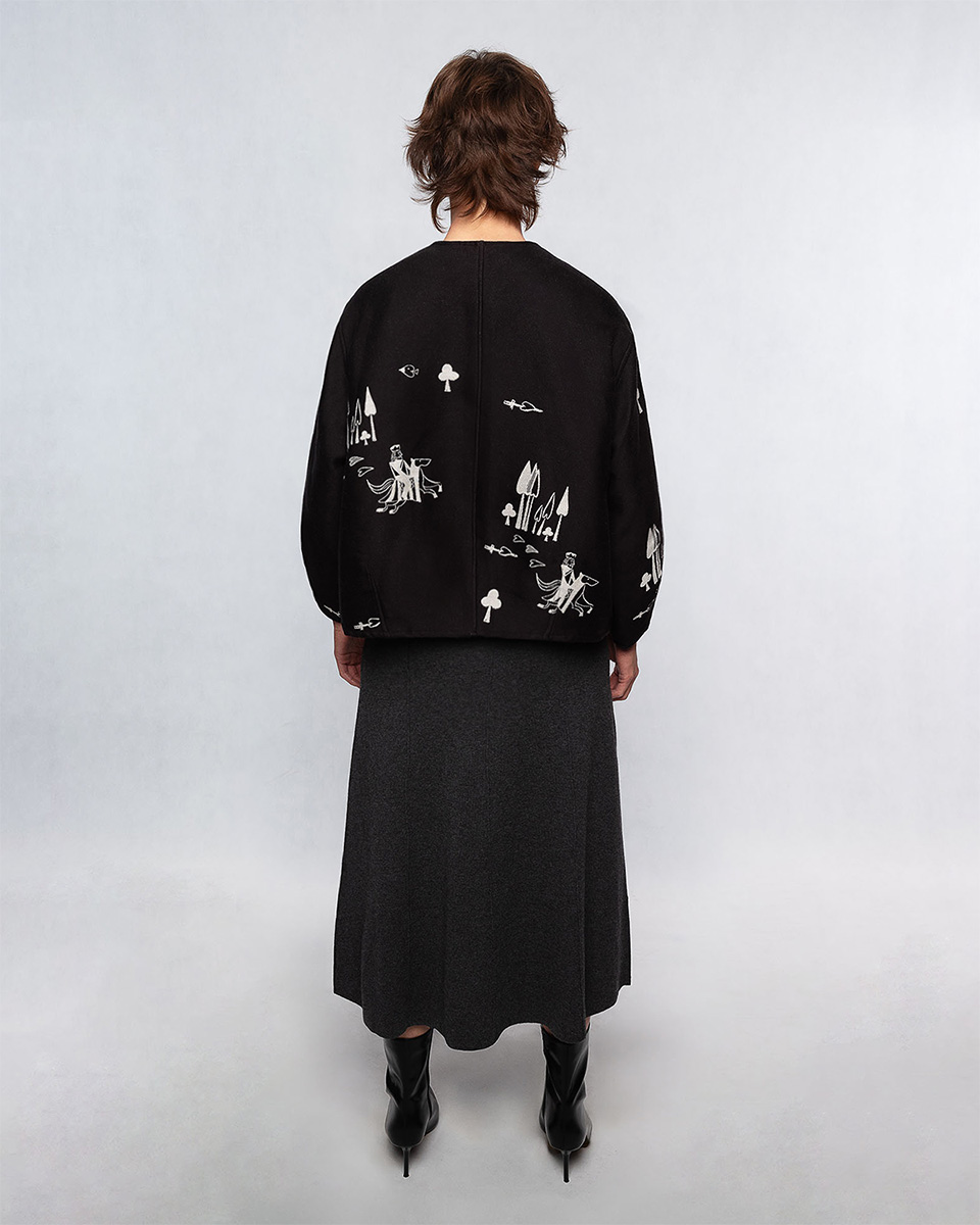 Żakardowa kurtka Belgijka DAMA SERCA powstała w efekcie twórczego spotkania z marką Aurelia & Zwei Frauen. Opowiada historię o walecznym rycerzu, który przemierza rozległe krainy, by odnaleźć swoją Damę Serca. Czy ta historia skończy się happy endem – tego nie wiemy. Jedno jest pewne – ten model pokochają wszystkie fanki unikatowych ubrań.